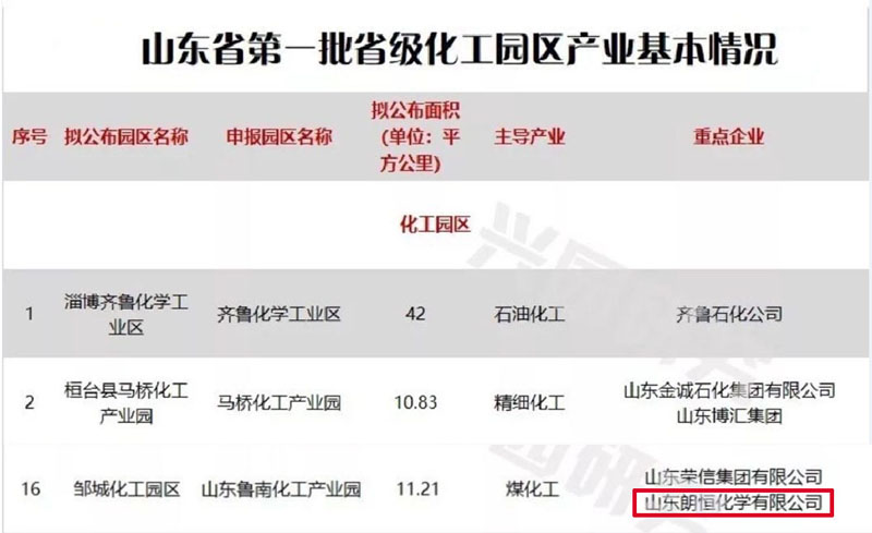 2018年5月16日山東省公布了首批通過認(rèn)定的33個園區(qū)以及57家重點化工企業(yè)。其中,山東習(xí)尚喜科技股份有限公司的全資子公司山東朗恒化學(xué)有限公司被列為山東省魯南化工產(chǎn)業(yè)園的重點企業(yè)。